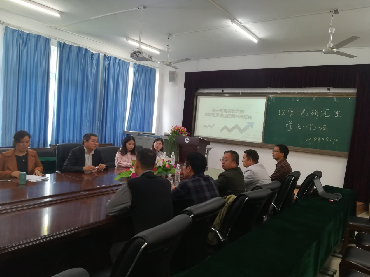 为启发和开拓专业硕士研究学生的科研思路,提升学生地理专业素养。2018年9月27日下午3点,经管学院于学院二楼会议室开展了学术论坛。论坛由科研科田文勇博士主持,参与论坛的有经管学院邬小学书记、杨建院长、周贤贵副院长、旅游地理系主任杨周博士、联合培养硕士研究生导师赵斌教授、卢德彬博士、田风霞博士、白彬副教授等教师,学科教学(地理)专业的联合培养硕士研究生喻婷、李维亚。