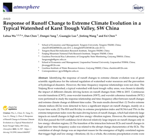 2023年5月,我院吴路华博士以第一作者在国际SCI期刊《Atmosphere》上,在线发表题为《Response of Runoff Change to Extreme Climate Evolution in a Typical Watershed of Karst Trough Valley, SW China》的学术论文(2023, 14(6), 927:1-20;IF=3.11),定量揭示了1984-2015年印江河流域径流变化对不同时间尺度极端气候演变的响应过程。