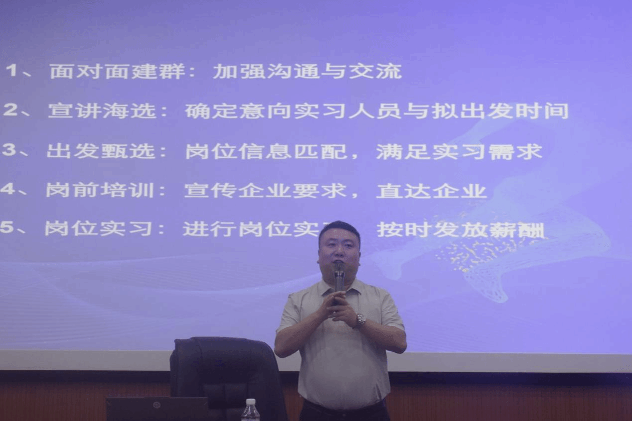 活动开场,王老师以极具启发性的方式开启话题。他强调了明确选择的重要性,提到选择一个有前途的工作、一家好公司及一个有幸福感的城市是关键。随后,王老师用自己的经历作为前言,介绍了一众招聘企业和企业相关情况。同时,介绍了所提供岗位的相关工资情况与良好的工作环境。在分享会的接近尾声时,王老师考虑到同学们对后续实习岗位的疑惑与需求,与同学们面对面建群。