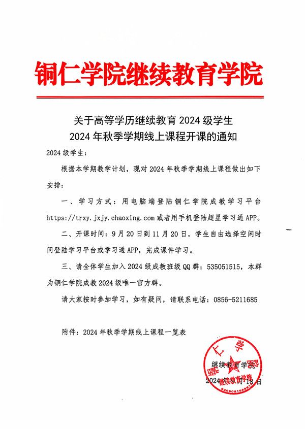 关于高等学历继续教育2024级学生2024年秋季学期线上课程开课的通知