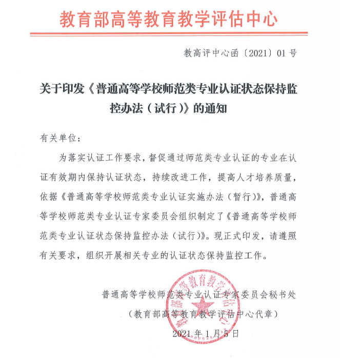 关于印发《普通高等学校师范类专业认证状态保持监 控办法(试行)》的通知