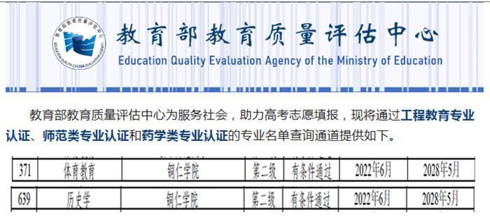近日,教育部教育质量评估中心公布2019年以来通过普通高等学校师范类专业认证专业名单,世界杯官网体育教育、历史学专业通过中学教育第二级认证,认证结论有效期六年(2022年6月至2028年5月)。
