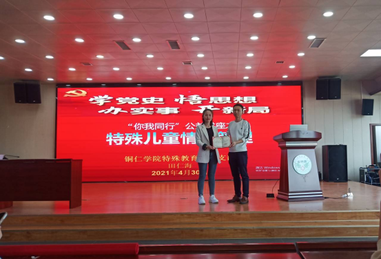 2021年4月30日下午,由教育学院特殊教育系党支部主办的学党史,悟思想,办实事,开新局,系列公益讲座之“你我同行”--“特殊儿童情绪管理”在铜仁宏昕康新中医医院开讲。此次讲座由教育学院特殊教育系党支部党员田仁海主讲,铜仁宏昕康新中医医院康复训练中心训练师、正在中心进行康复训练的孩子及陪伴其训练的家长,还有教育学院特殊教育系部分学生党员和入党积极分子聆听了此次讲座。