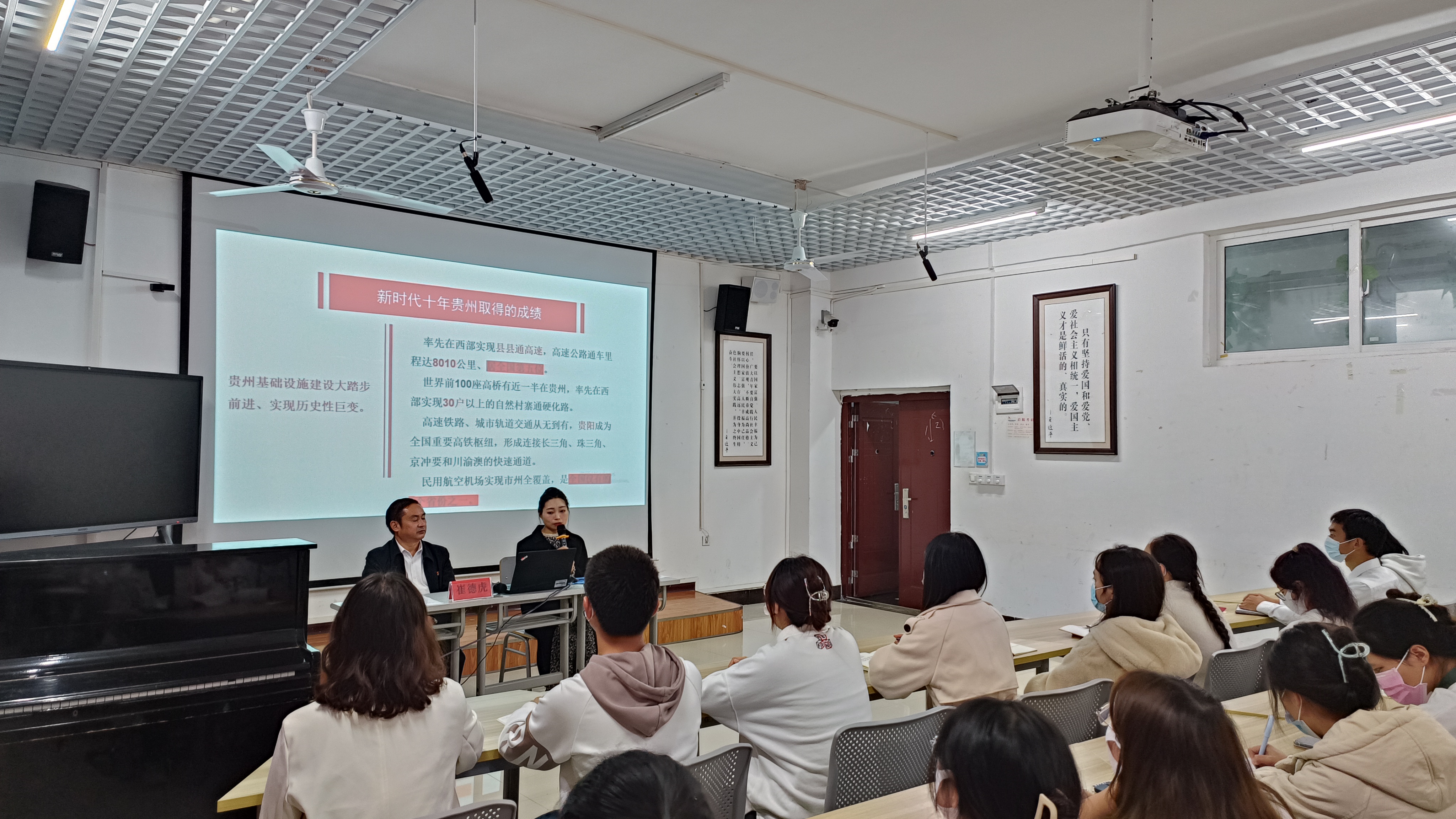 首先,谢焕庭老师以“学习党的二十大精神,争做新时代好青年”为主题,对党的二十大精神进行了解读,帮助同学们更好地理解党的二十大精神内涵。接着,崔德虎教授与同学们一起学习了党的二十大精神,重点从教育、科技、人才方面进行学习。之后,崔德虎教授还分享了自己的成长经历:从山村小学走上大学讲台、传承黔东本土文化、用文艺助力乡村振兴,他用自己的成长故事激励同学们勇毅前行。最后,进行了师生互动交流。