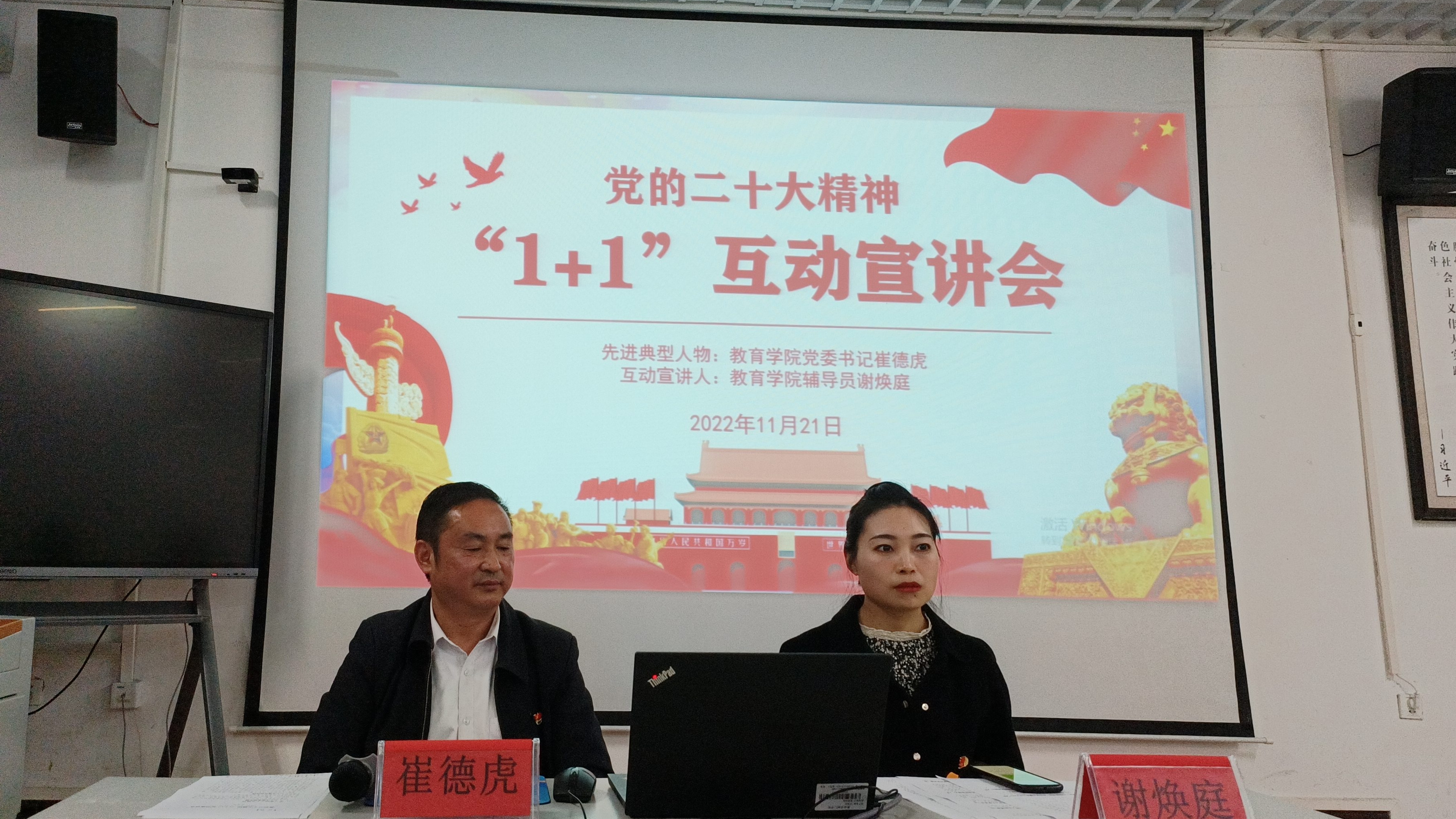 为深入学习贯彻落实党的二十大精神,2022年11月21日,教育学院党委在明理楼B302多功能教室开展了党的二十大精神“1+1”互动宣讲会,第九期入党积极分子培训班全体同学参加本次宣讲会。教育学院党委书记崔德虎教授、辅导员谢焕庭老师出席宣讲会,宣讲会由谢焕庭老师主持。