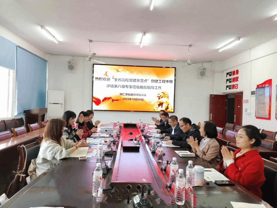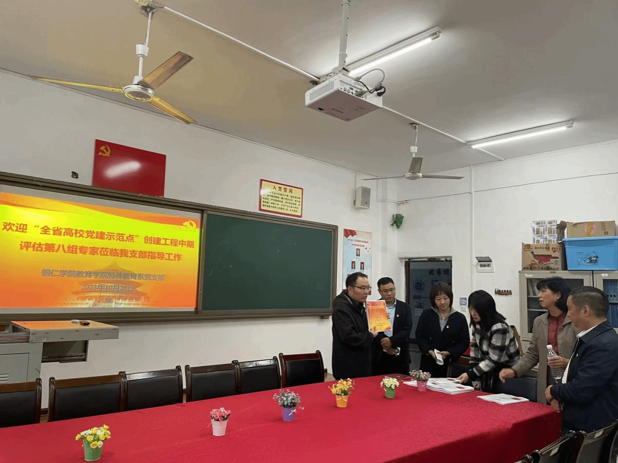 2023年10月26日,省委教育工委第八检查组到教育学院实地检查特殊教育系党支部“全省党建工作样板党支部”创建工程中期建设工作。省委教育工委第八检查组组长由贵州理工学院党委组织部副部长、机关党委书记王琳同志担任,检查组成员有贵州理工学院党委组织部何盈盈同志、何丹妮同志。美加墨世界杯官方网站党委组织部副部长周慧娟同志,教育学院党委副书记吴承品同志,教育学院党委委员、党政办主任敖俊同志,特殊教育系党支部书记刘方林同志,基础教育系党支部书记杨秀琴同志,学生党支部组织委员谢焕庭同志,特殊教育系党支部全体党员同志及学生代表参加会议。会议由教育学院党委书记崔德虎同志主持。 座谈会上,首先播放了中共贵州省委宣传部“文艺精品”创作扶持重点项目成果《黔东红色组歌》视频;接着,崔德虎书记对专家组的莅临检查指导支部创建工作表示热烈欢迎,并简要介绍了教育学院党建工作开展情况。刘方林同志汇报了特殊教育系党支部省级样板党支部中期建设进展情况,他重点介绍了“党建引领下特殊教育专业医教结合‘1+3’服务育人”模式以及党支部“1451”党建工作机制。