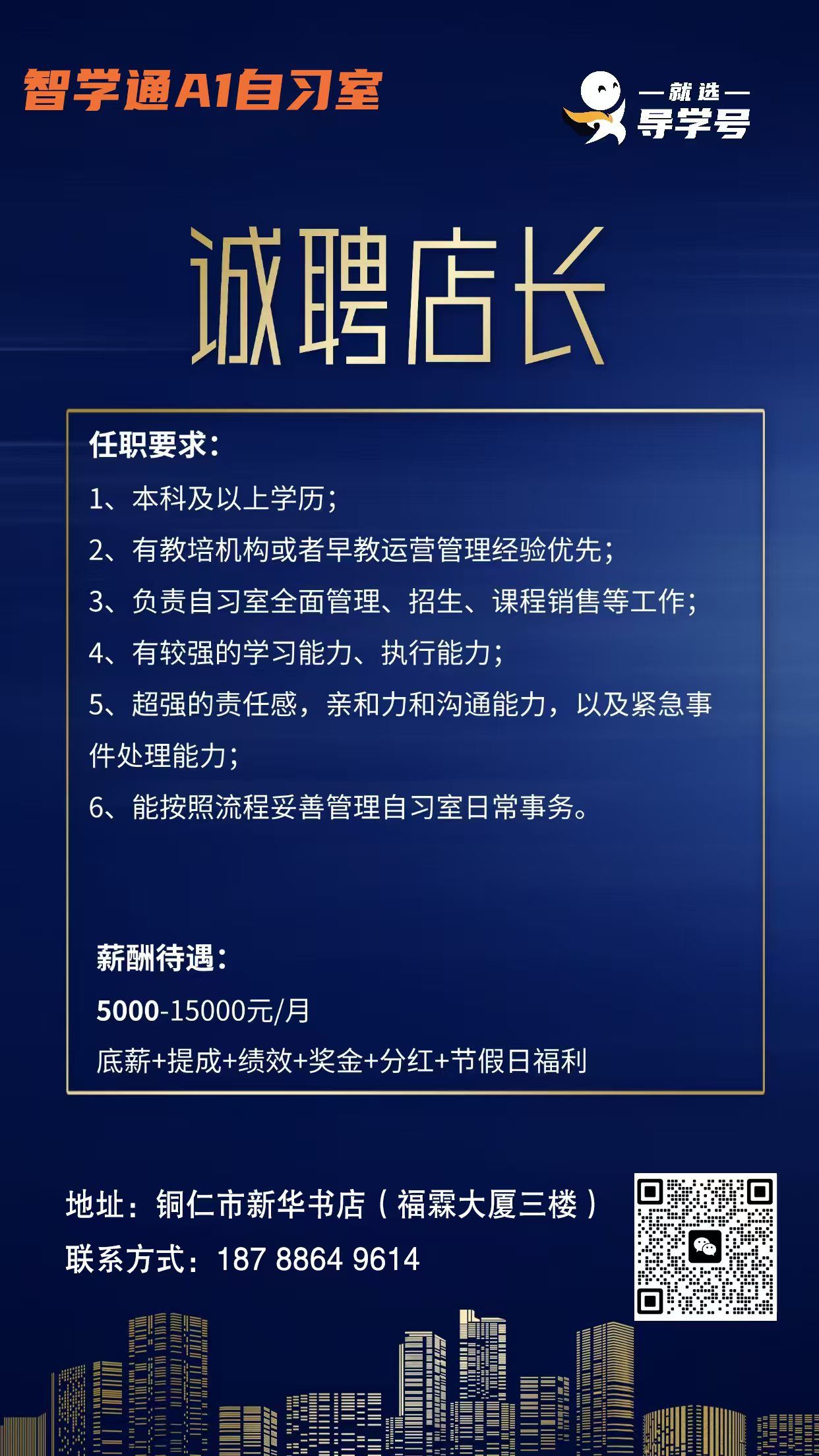 (一)自习室店长 :本科及以上学历,有教培机构或早教运营管理经验者优先。主要负责自习室全面管理、招生、课程销售等工作,需具备较强的学习能力、执行能力,超强的责任感、亲和力和沟通能力,以及紧急事件处理能力,能妥善管理自习室日常事务。