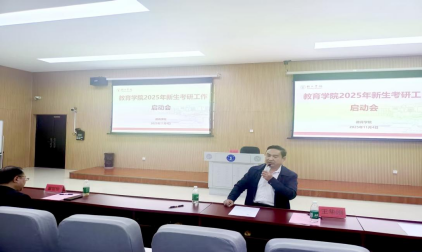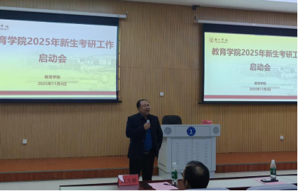 为激发2025级新生考研热情,明确学业发展规划,营造积极向上的学习氛围,11月4日晚,教育学院在博思楼105举行2025级新生考研工作启动会。教育学院党委书记崔德虎教授、副院长董世华教授、副院长王华刚副教授,部分教师及2025级全体新生共同参会。会议由教育学院教务科科长陆艳博士主持。