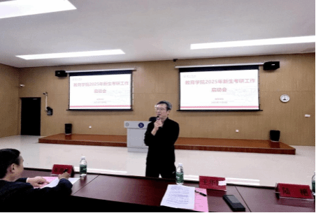 会议最后开展考研宣讲培训,由考研班班主任刘方林博士主讲。他结合近年考研数据,分析教育学院学生考研现状,指出专业课成绩是决定考研成败的关键,并围绕“为什么考研”“考什么学校”“考什么内容”三大核心问题作系统讲解,为新生备考理清思路。