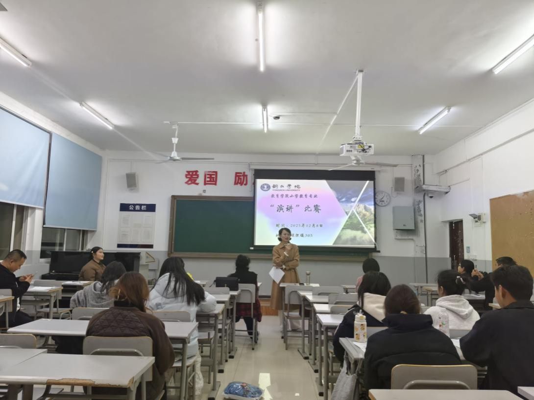 每位参赛选手都做足了功课,以饱满的热情、自信的姿态开启了自己的演讲展示。选手们的演讲各有亮点:2025级小学教育班杨光海以《孤舟一夜承清梦,巨轮万里拓长天》为题,将个人成长喻作“孤舟”,把教育理想比作“巨轮”,以诗意的表达与深刻的职业思考,赢得评委与观众的一致认可,最终斩获一等奖;2023级小学教育(1)班陈琳的《跨越时代的对话》、2024级小学教育(2)班符娟的《迷茫》凭借真挚的情感与清晰的立意荣获二等奖。