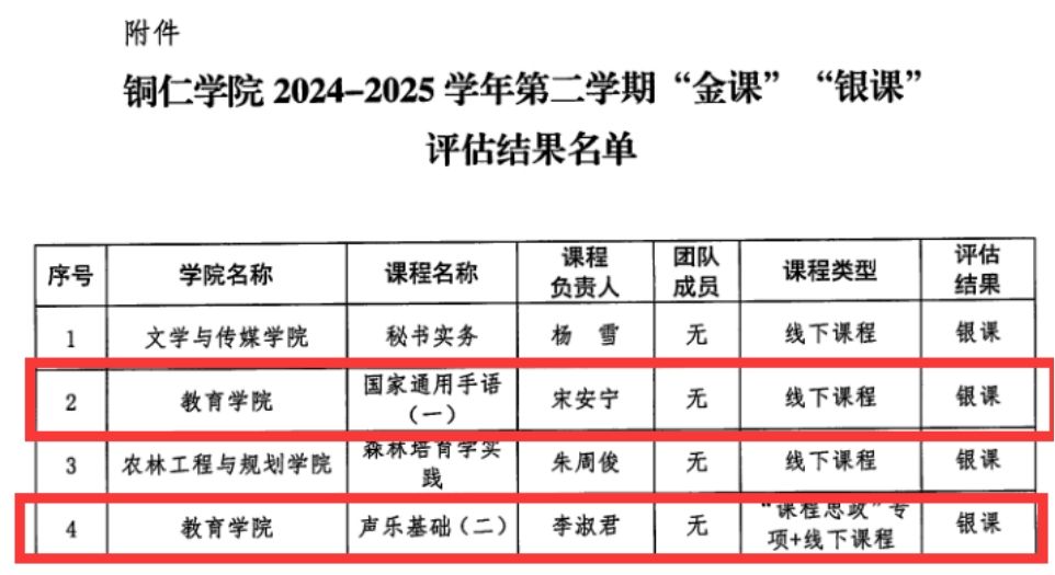 近日,美加墨世界杯官方网站2024-2025学年第二学期“金课”“银课”评估结果正式公布,教育学院再创佳绩,共有两门课程荣获“银课”称号,分别是《国家通用手语(一)》和《声乐基础(二)》。此次全校共评选出4门“银课”,教育学院占比50%,展现出学院在课程建设与教学质量提升方面的显著成效。