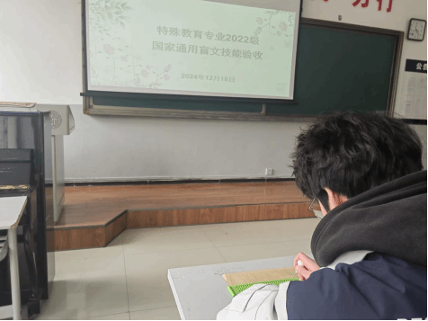 12月18日-19日验收的项目是国家通用盲文和国家通用手语,国家通用盲文考核的具体内容为选择题盲译汉(字词、成语)、判断题盲译汉(诗句盲符的判断)、填空题盲译汉(数字、成语)应用题盲译汉(数学运算)和写作题汉译盲。国家通用手语考核的具体内容为选择题(看图选文、看文选图)、简答题(描述手语释义)、翻译题(翻译句子和视频)。验收形式则都采用线上检验的方式进行,这种创新的测试形式不仅适应了当前数字化教学的趋势,也为学生提供了一个更加灵活和便捷的考核环境。学生们在技能验收中表现出色,并严格遵守验收纪律,体现了同学们在学习过程中的努力认真,充分展示了特殊教育专业学生的风采。