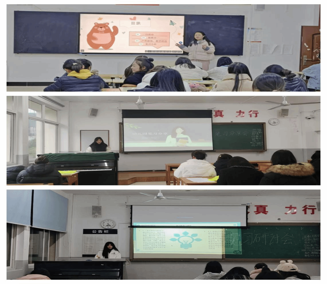 11月25日晚上,各见习班级在班主任的组织下,开展了集体见习交流会,分享自己的见习经历和心得。随后一周,1+1+x导师团队继续组织学生围绕研习大纲中的任务开展研习活动。通过小组合作的方式,同学们进一步研讨了在见习过程中发现的保教实践问题,针对存在的问题提出了相应的解决措施。这些主题性的研讨不仅巩固了专业知识,还提升了同学们的反思能力和解决实际问题的能力。