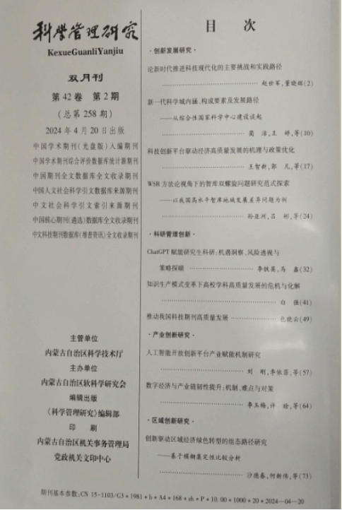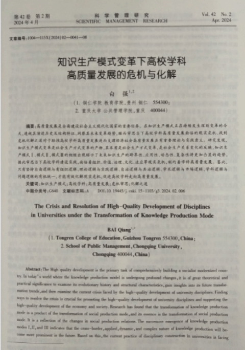 近日,管理学CSSCI核心来源期刊《科学管理研究》2024年第2期刊发世界杯官网白强教授的研究成果《知识生产模式变革下高校学科高质量发展的危机与化解》,全文近15000字。该文系白强教授主持的国家社科基金全国教育科学规划国家一般课题“知识生产模式变革下高校学科建设高质量发展的路径创新研究”(立项编号:BIA220053)的最新研究成果,亦是白强教授以独立作者四度在管理学CSSCI核心来源期刊发表课题研究成果。
