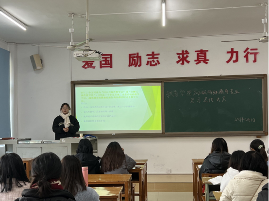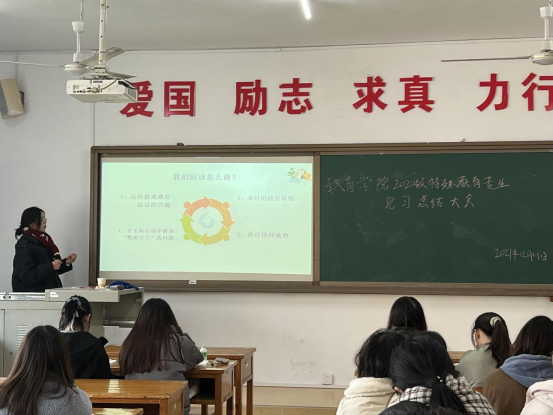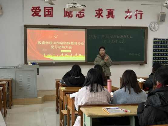 为了加强学生专业学习,培养学生实践能力,根据《特殊教育专业人才培养方案》及《教育见习大纲》要求,2021-2022学年度第一学期特殊教育系2020级特殊教育班为期一周的见习活动结束,并于12月21日在明理楼B409开展特殊教育系见习总结大会。参加本次活动的有特殊教育专业教研室主任宋健老师与2020级特殊教育班全体学生。