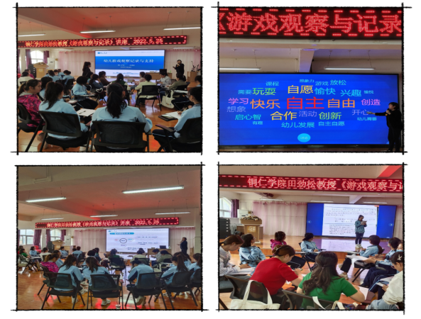 见面会结束后,田劲松教授开始了《游戏观察与记录》讲座,从“游戏的定义” “教师观念的转变”“幼儿园的环境、材料投放”等方面进行了游戏相关理论的梳理,并针对幼儿园提交的游戏观察记录表来讲解“游戏观察与记录”的注意事项。聆听讲座的老师们积极参与到“游戏的意义”“观察记录表”的主题讨论中,田劲松教授做出精彩点评,解答了出现的问题并鼓励将分享中出现的好点子积极落实。老师们纷纷表示此次培训让他们受益匪浅,让他们对放手游戏的指导有了更深入的理解,教育理念的变化将促进了师幼的共同成长。