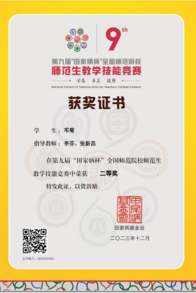 我院邓菊同学荣获第九届“田家炳杯”全国师范院校师范生教学技能竞赛二等奖