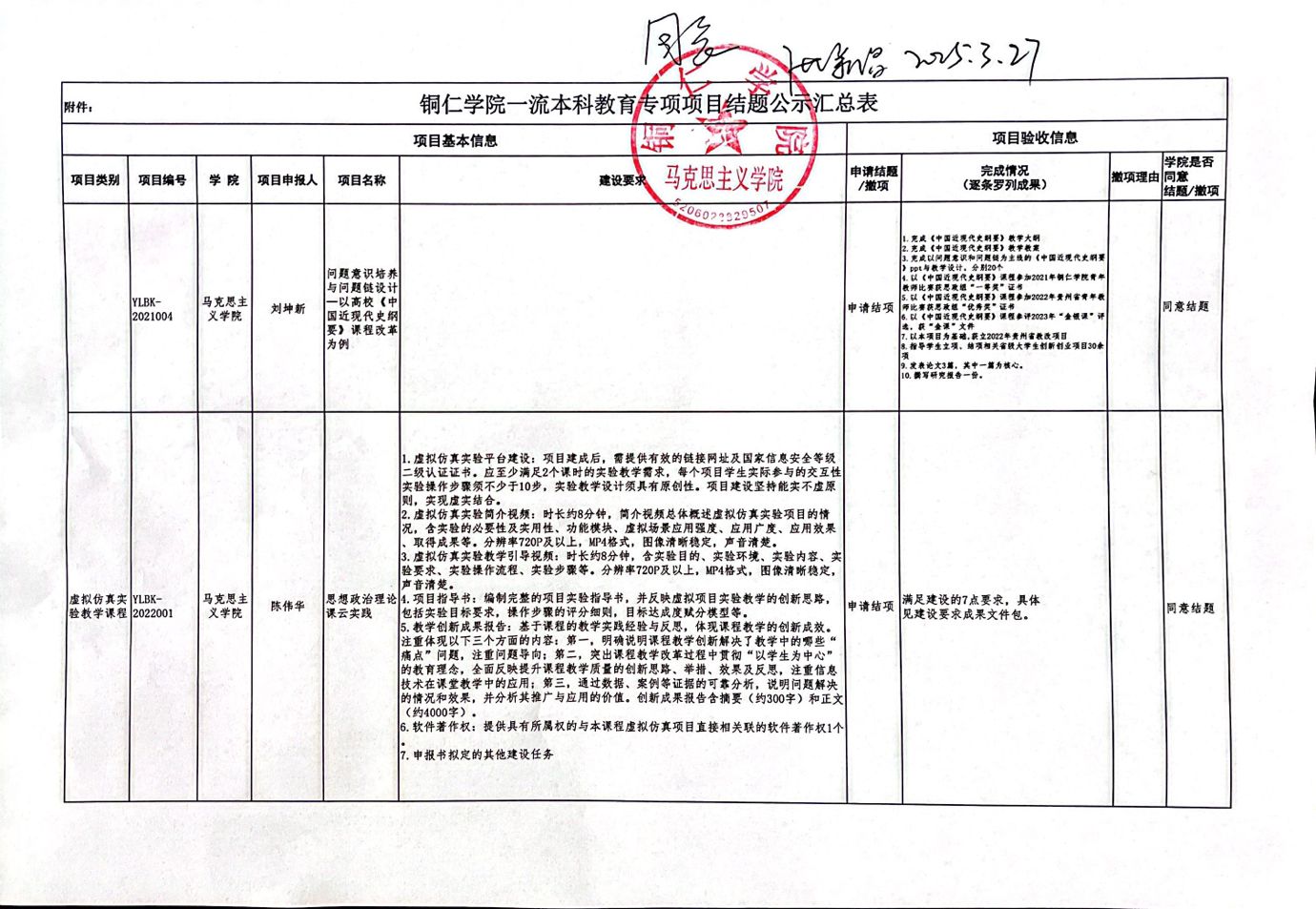 经过马克思主义学院教学指导委员会评审后,同意我院刘坤新和陈伟华两位教师的一流本科教育专项项目结题。