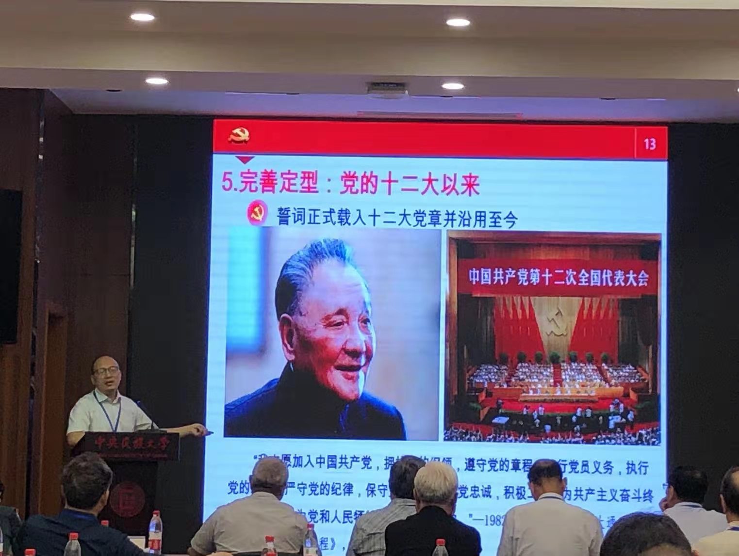 7月22—25日,“奋斗百年路 启航新征程——民族哲学的问题意识与使命担当”全国学术研讨会暨中国少数民族哲学及社会思想史学会2021 年年会在中央民族大学顺利举办。本次会议由中国少数民族哲学及社会思想史学会和中央民族大学主办,中央民族大学哲学与宗教学学院 、《中央民族大学学报》编辑部承办。我院王德召教授应邀赴北京参加此次学术研讨会。王德召全程参与了会务组安排的学术研讨活动,25日,根据会议安排做了题为《中国共产党成立以来入党誓词变迁的历史回顾当代启示》的主旨报告,报告中在历史溯源的基础上,分五个历史时期回顾了百年来中国共产党入党誓词的变迁历程,并从中提炼对新时代党的建设的启示。