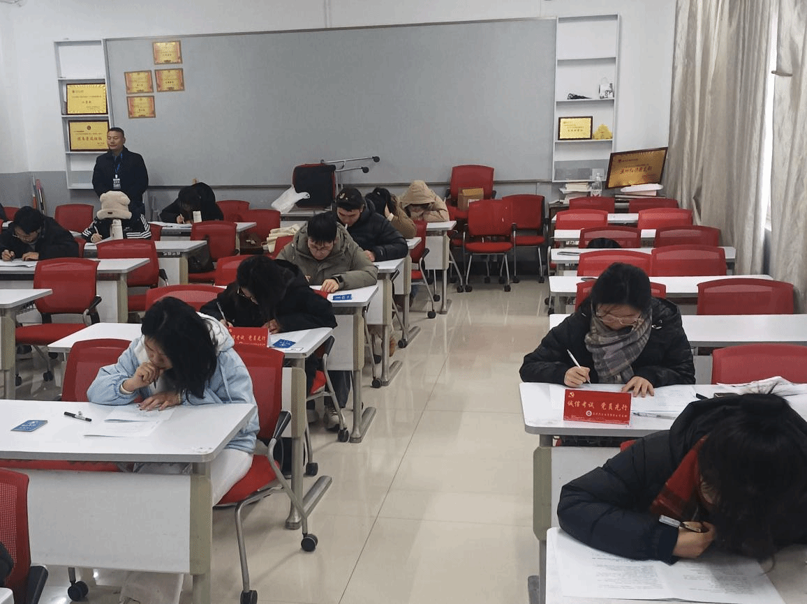 考前,学院通过支部大会、主题班会、诚信考试动员大会等形式,引导学生党员深刻认识诚信考试的重要意义,明确党员“亮身份、作表率”的责任担当。考试期间,全体学生党员严格按照要求,在座位显著位置摆放特制的“诚信考试,党员先行”红色标识牌,主动亮明党员身份,公开承诺恪守考场纪律、坚决抵制作弊行为。小小的标识牌既是身份的象征,更是责任的宣告,时刻提醒学生党员以高标准严格要求自己,成为考场中纪律维护与诚信践行的“标杆力量”。