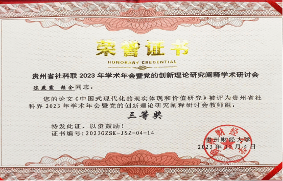祝贺:我院硕士研究生陈燕霞参加“贵州省社科界2023年学术年会暨党的创新理论研究阐释研讨会”,参会论文荣获三等奖