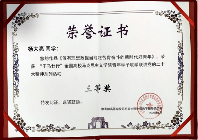 此次活动分为四个阶段,分别是活动承办单位注册、联学共建、联合备课、联合巡讲活动。收到活动邀请函之后,世界杯官网马克思主义学院高度重视,精心组织,在指导老师的精心指导下,宣讲团成员认真撰写讲稿、制作课件、反复磨课并深入各班展开宣讲。宣讲团的宣讲思路清晰、激情澎湃、举例丰富且贴近生活实际,取得了良好的宣传效果。11月下旬,从宣讲团成员中推荐了2名优秀学生参加联学联讲集中展示活动,录制了宣讲视频作品,并按要求上传至大学生“青梨派”自主学习平台。最终,经过专家评委评审,杨大亮同学的作品《做有理想敢担当能吃苦肯奋斗的新时代好青年》在学院李芬、王德召以及迟婕等多位老师的精心指导下脱颖而出,荣获了三等奖的佳绩;蒙富英同学的作品《阔步迈向中国式现代化新征程》也喜获入围奖。