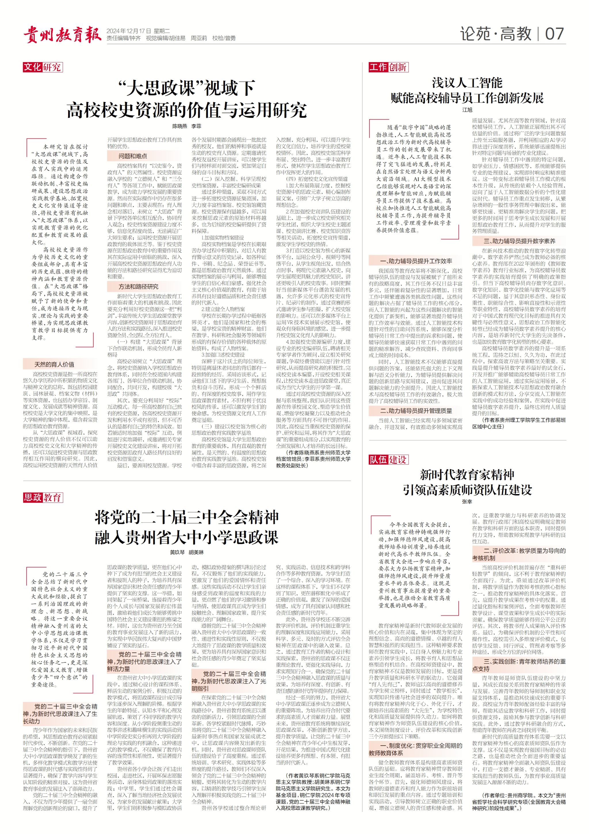 2024 年 12 月 17 日,世界杯官网黄玖琴教授与研究生胡美琳在贵州教育报发表了题为《将党的二十届三中全会精神融入贵州省大中小学思政课》的理论文章。