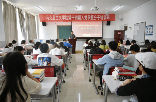 3月27日中午,我院第十四期入党积极分子培训班在依仁楼A204教室举行开班仪式。党委书记张江林出席并作动员讲话,党委副书记李兢作学习纪律要求,学生党支部书记杨学礼主持开班仪式。