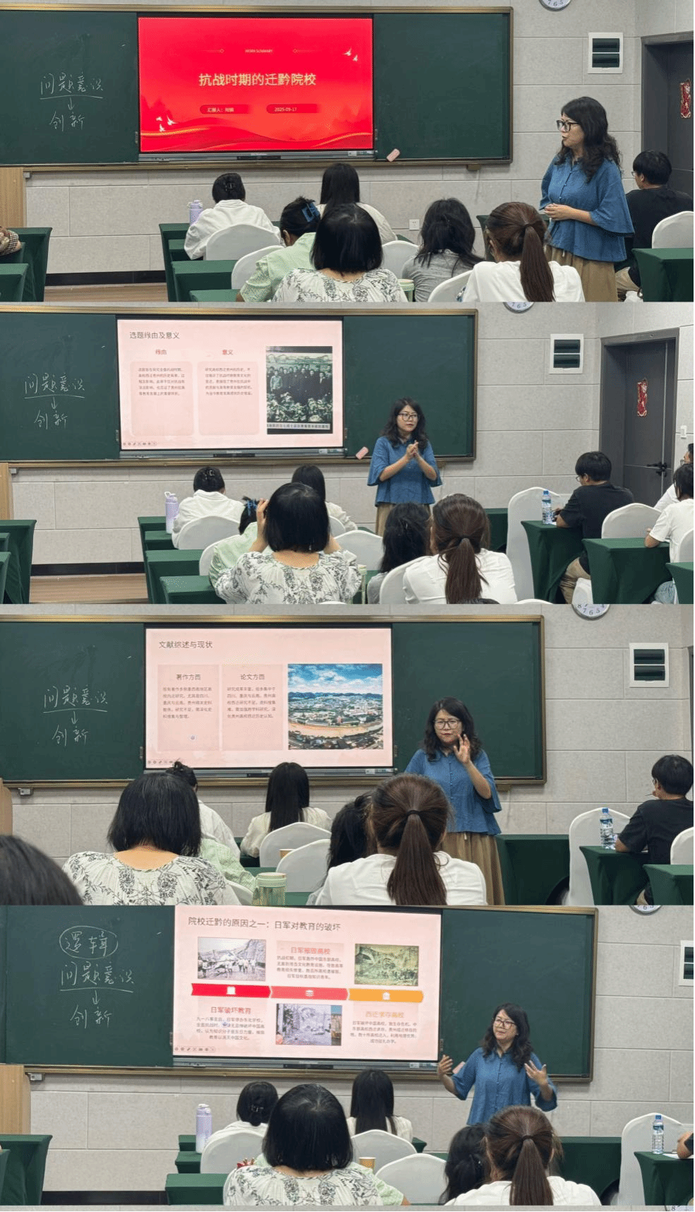 2025年9月17日,美加墨世界杯官方网站马克思主义学院于学科楼604教室开展了红色引领·思政育人系列讲座暨纪念抗日战争胜利系列讲座第五讲——抗战时期的迁黔院校。本次讲座特邀阳娟老师担任主讲,以“抗战时期的迁黔院校”为题开展主题学习教育,马克思主义学院全体硕士研究生参加。