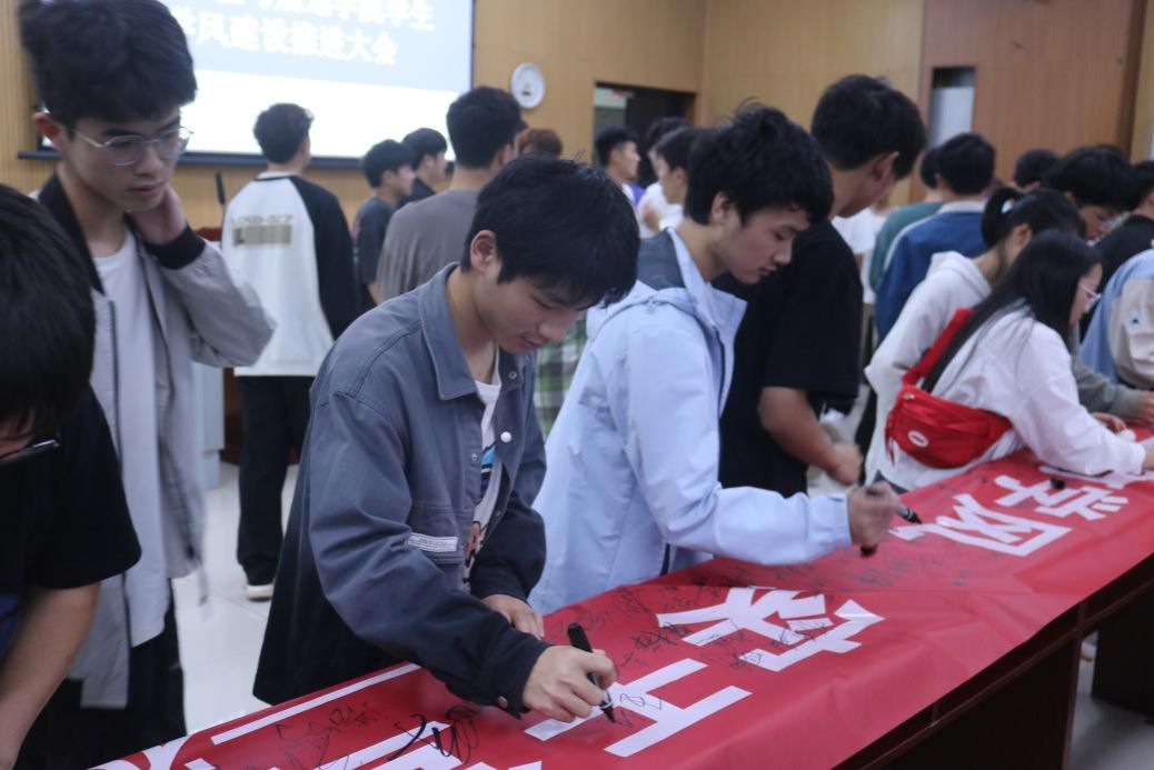 大会在庄严的国歌声中拉开帷幕。会上,张俊波宣读了《美加墨世界杯官方网站2024年学生学风建设实施方案》,指出全体师生要把握好学风建设总体要求,积极主动投入到学风建设工作中,有针对性地开展学风建设活动,切实培养学生的主动性和积极性。李建新宣读了近期学生违纪的相关文件,通报中包括学生考试舞弊、赌博、酗酒斗殴等问题,指出全体学生要引以为戒,充分认识到违规违纪的重要性,严格遵守学校学生管理规定,守牢校园安全底线。学生代表李沁瑾(20级水产养殖学专业)作为了发言,分享了个人学习经历和所在班级四年的整体青春风采和先进事迹,讲述了学风建设对班级管理的重要性,鼓励同学们要爱自己的学习、自己的班级、自己的学校,要带着目的学习,提前做好规划,这样才能提升学习效率。学生会干部潘婷带领全体参会同学庄严宣誓,激励自己要端正学习态度,坚定理想信念,在筑牢学风建设上以身作则,宣誓完后并在横幅上签字。最后,米小其作了重要讲话,就我院学生学风建设工作提出了具体要求:一是要高度重视,加强领导,充分认识学风建设的重要性;二是要围绕“爱国、励志、求真、力行”,积极参与和创建优良学风;三是要围绕“四有好老师”,当好引路人,成为“大先生”。