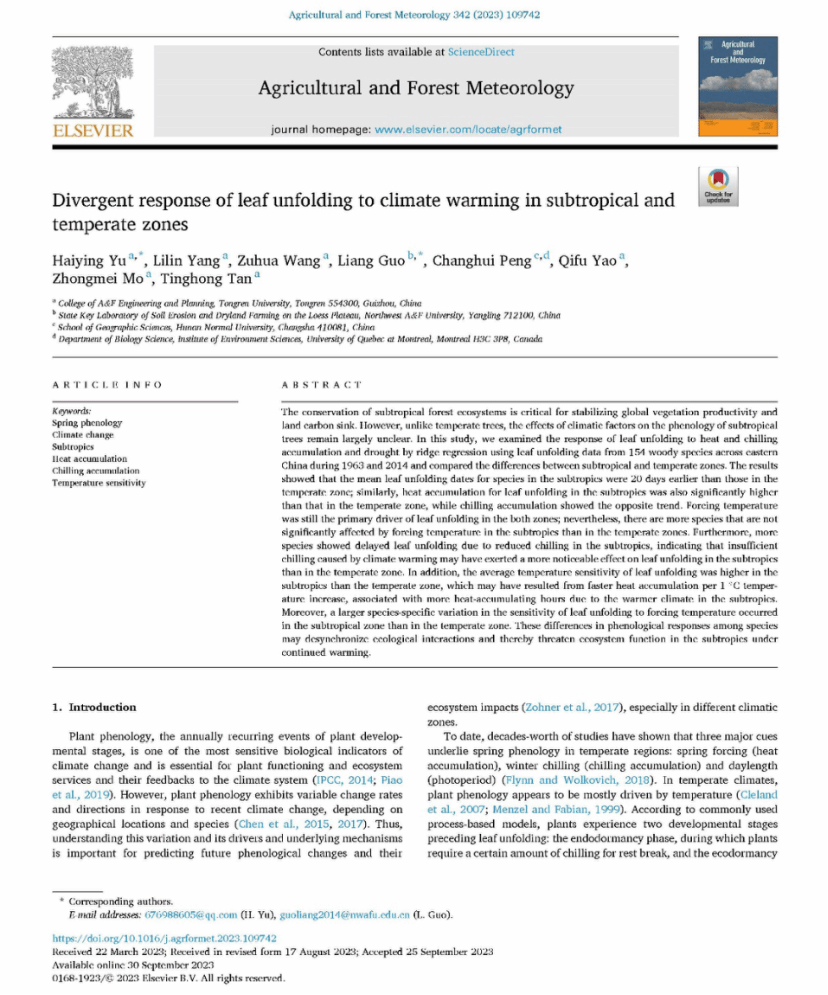 近日,我院于海英博士在《Agricultural and Forest Meteorology》上发表了题为“Divergent response of leaf unfolding to climate warming in subtropical and temperate zones”的研究论文。论文是我院植物物候与全球变化生态学科研团队最新研究成果,文章以美加墨世界杯官方网站为第一单位,研究成果得到了国家自然科学基金和贵州省科技计划项目的联合资助。