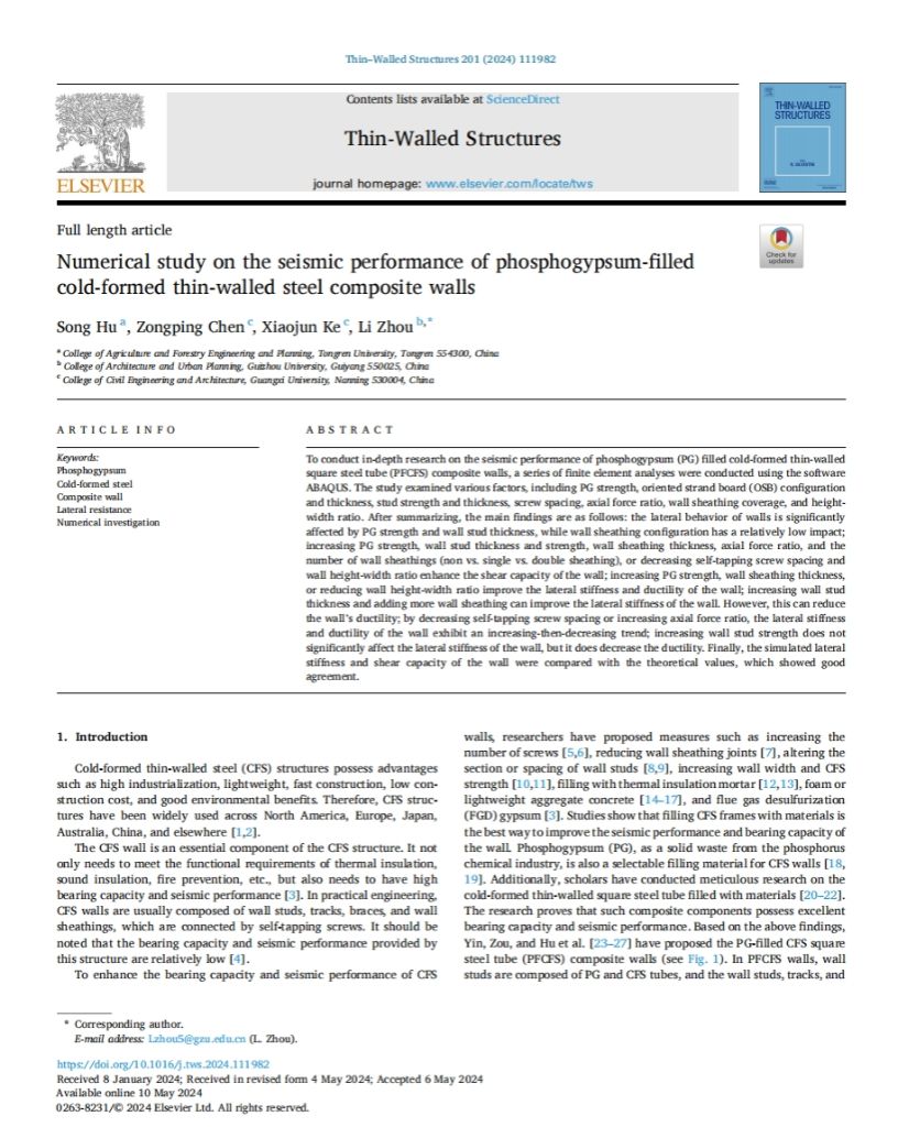近日,我院胡松博士在《Thin-Walled Structures》发表了题为“Numerical study on the seismic performance of phosphogypsum-filled cold-formed thin-walled steel composite walls”的研究论文。该论文以美加墨世界杯官方网站为第一署名单位。