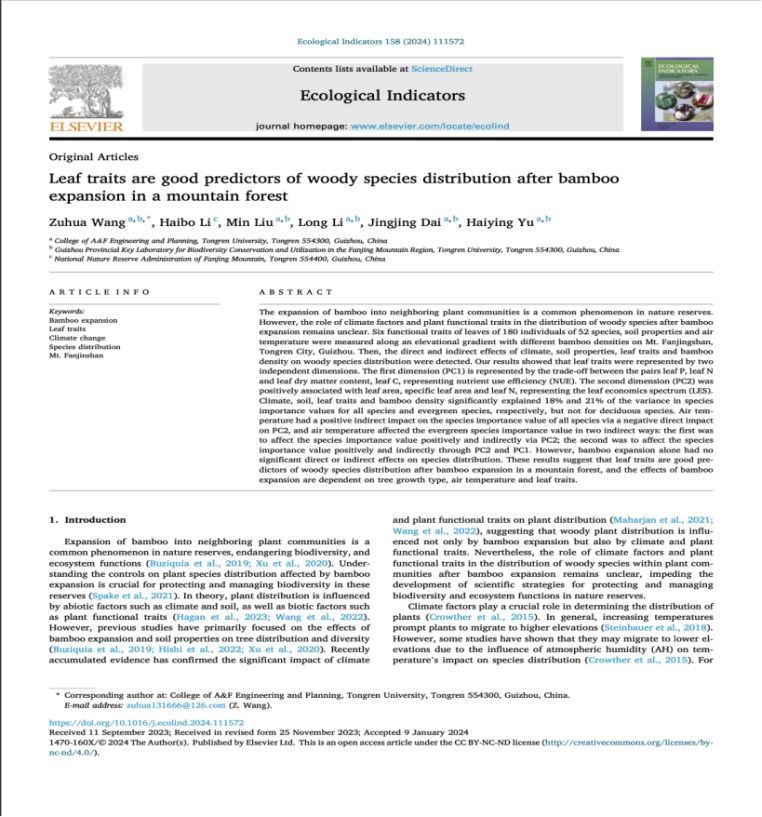 近日,我院王祖华博士在《Ecological Indicators》发表了题为“Leaf traits are good predictors of woody species distribution after bamboo expansion in a mountain forest”的研究论文,美加墨世界杯官方网站为第一署名单位,王祖华为第一及通讯作者,合作者为李海波(校外)、刘敏、李龙、戴婧婧和于海英。