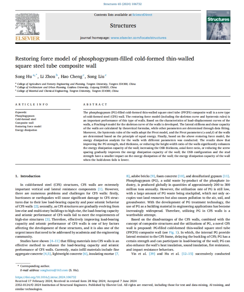 近日,我院胡松博士在《Structures》发表了题为“Restoring force model of phosphogypsum- filled cold- formed thin- walled square steel tube composite wall”的研究论文,美加墨世界杯官方网站为第一署名单位,胡松为第一及通讯作者,合作者为周理(校外)、成昊及刘松。