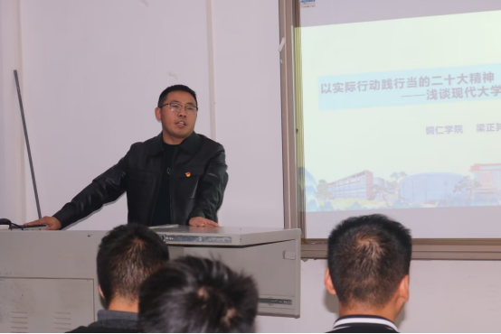 梁正其以“以实际行动践行党的二十大精神——浅谈现代大学生成长成才之路”主题展开宣讲,围绕二十大精神提出“什么是责任”“我的责任是什么”“要成才,如何成长、成才”,以及结合自己的成长历程,鼓励大家要成长为一个对社会有用的人才,应要“学会认知,学会做事,学会互动,学会做人,”“打下坚实的学术基础,塑造优秀的人格品质,符合社会需求是成才的关键”等方面进行了宣讲。