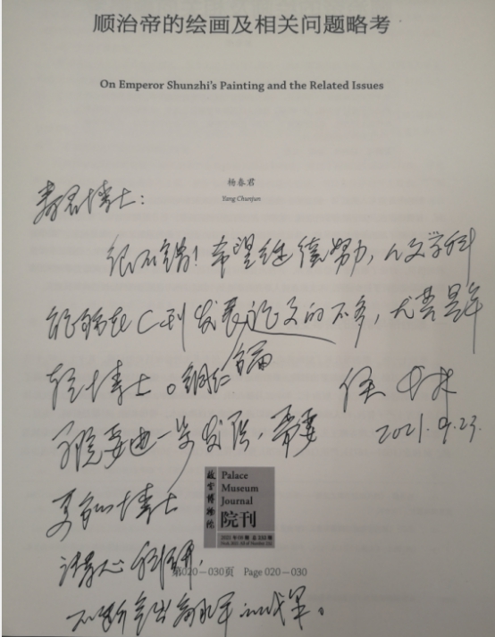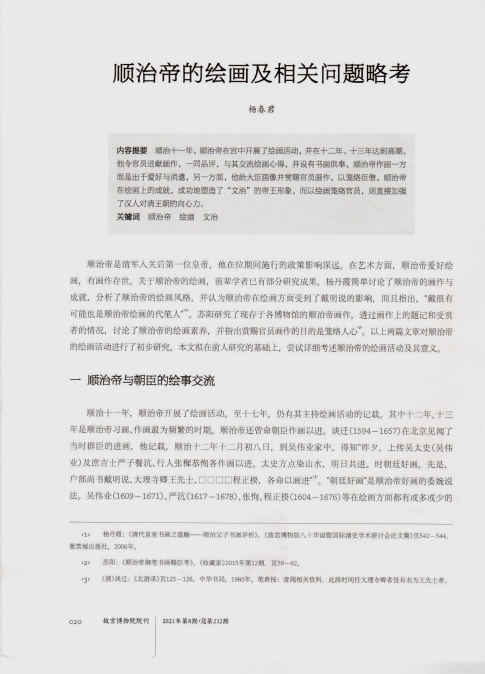 我院历史系杨春君博士在《故宫博物院院刊》2021年第8期上发表了题为《顺治帝的绘画及相关问题略考》的论文。该刊系考古学CSSCI刊物。