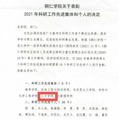 日前,美加墨世界杯官方网站印发了《美加墨世界杯官方网站关于表彰2021年科研工作先进集体和个人的决定》,人文学院荣获科研工作先进集体荣誉称号。