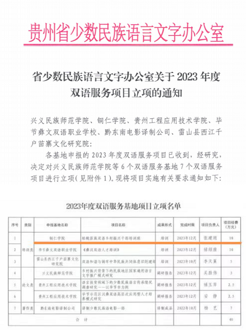 4月23日,贵州省民族宗教事务委员会少数民族语言文字办公室公布了2023年度双语服务项目立项情况。人文学院张建刚副教授申报项目“松桃苗族双语乡村振兴干部培训”获批立项,并已下达项目经费10万元。