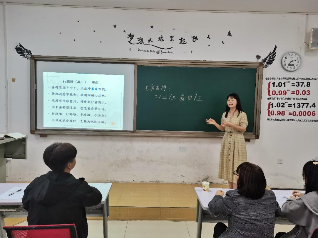 张琳老师授课内容为古诗《行路难》。在课堂导入环节,张老师通过带领学生诵读,向大家展示了诵读教学的魅力。张老师强调,诵读古文需掌握三大要领:字音、节奏、情感。接下来的授课过程中,张老师运用了朗读式与讨论式等教学手段,深入浅出、循循善诱,引导学生积极参与,认真思考,激发了学生的学习兴趣和求知欲。在交流环节,张琳老师结合自身经历从教学理念、教学经验等方面与学生展开详细探讨,提出了“教学是师生交往、积极互动、共同发展的过程”的教学观点。