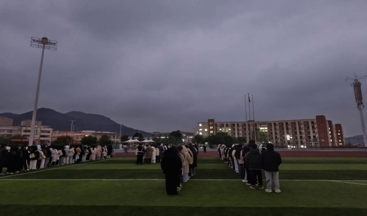 清晨七时,全体同学已在操场整齐集合,升旗仪式准时开始。国旗仪仗队迈着铿锵有力的步伐,护送五星红旗进场,全场师生肃立,面向国旗行注目礼。伴随着国歌《义勇军进行曲》的激昂旋律,五星红旗冉冉升起,迎风飘扬。