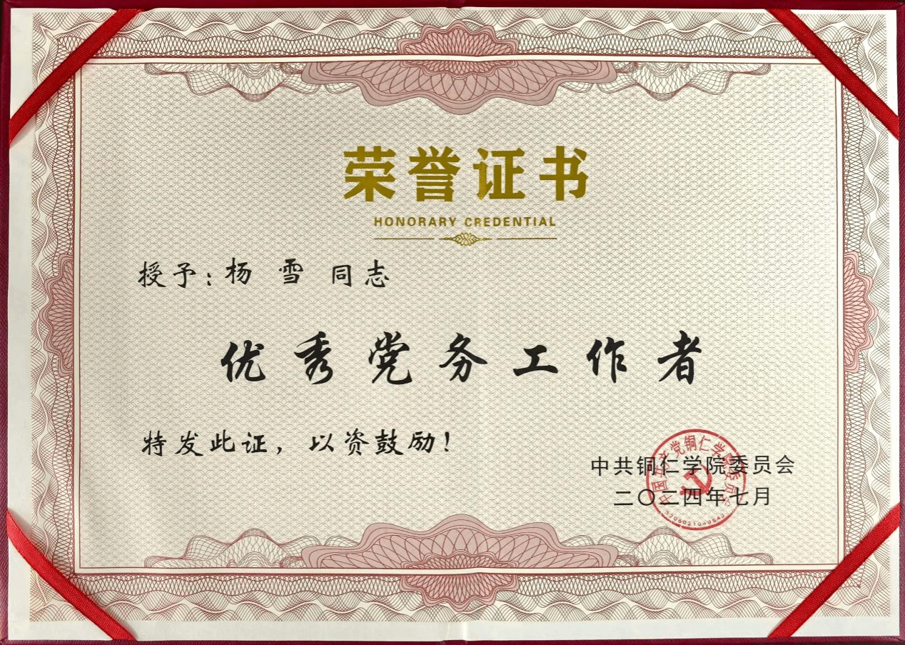 杨雪2010年加入中国共产党,现任文学与传媒学院党委副书记、副教授。自参加工作以来,一直从事党务工作,历任教工党支部组织委员、党务科科长等职。工作中她热忱为全院师生做好服务,解决困难,积极认真做好困难学生帮扶工作,指导学生参与各项比赛多次获奖。作为主要负责人申报的全省高校第二批“三全育人”综合改革试点院系成功获批,推动实施文学与传媒学院党建品牌创建工作,成效明显。自承担党务工作以来,她多次获得校级优秀共产党员、党务工作者表彰,在2016年至2021年党员民主评议中连续六年荣获优秀等次。
