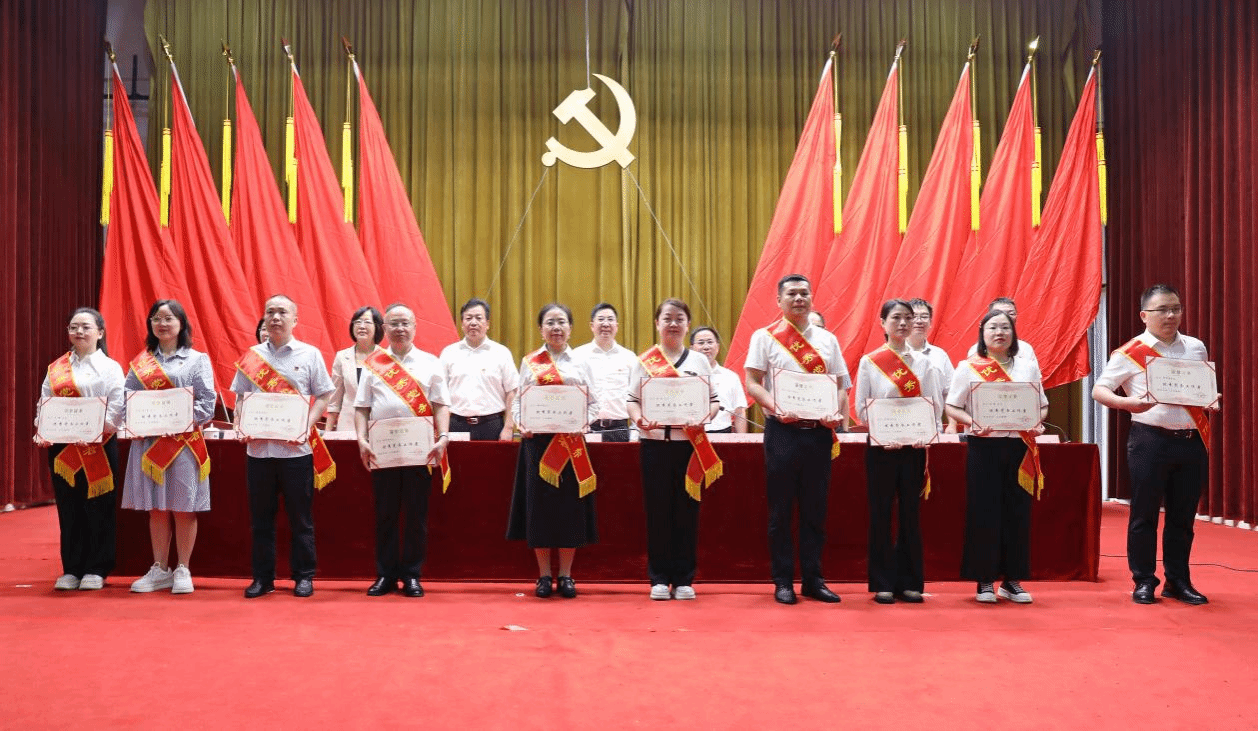 受表彰的优秀党务工作者代表领奖留影,右5为杨雪