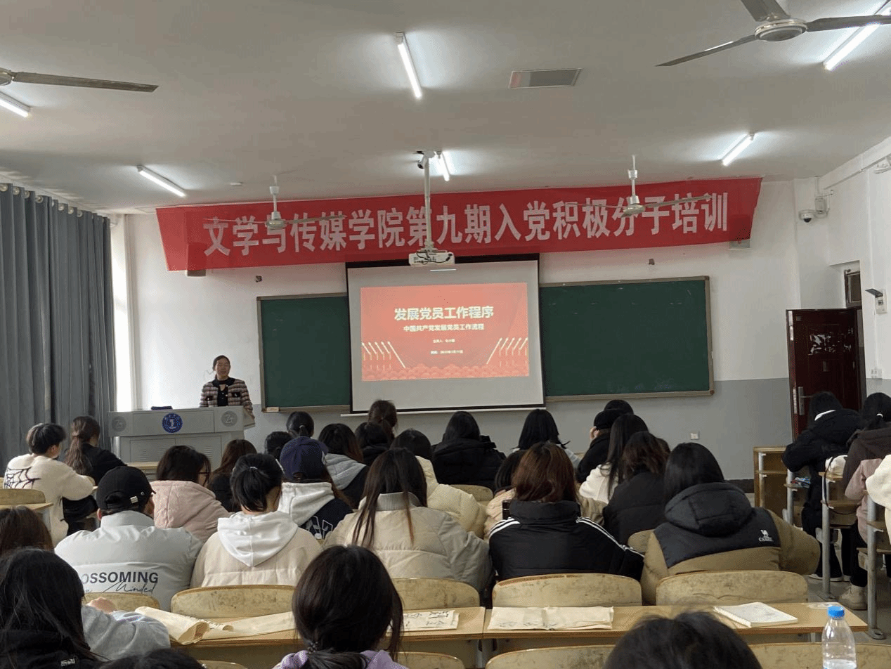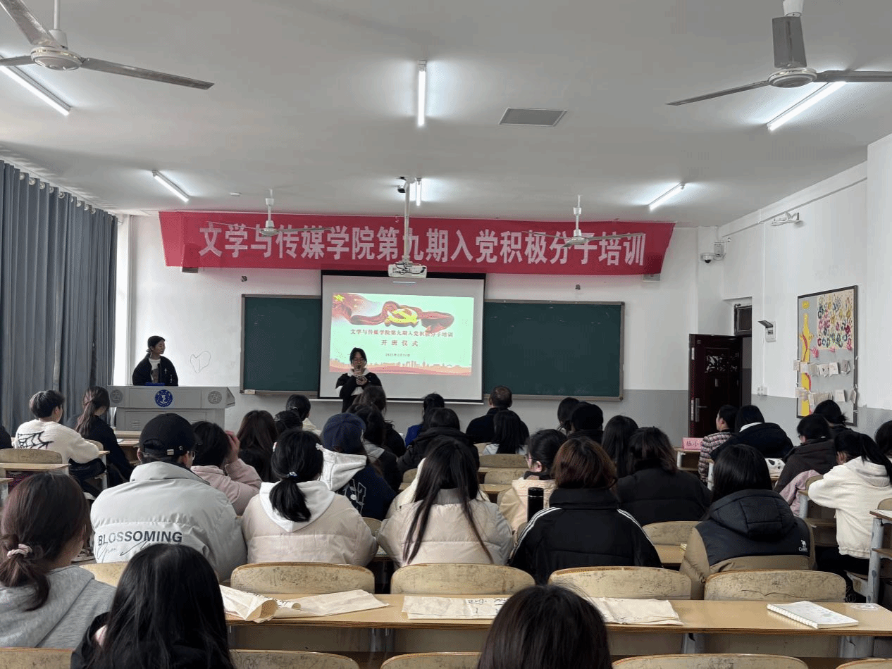 3月31日,文学与传媒学院九期入党积极分子培训开班仪式于依仁楼A402教室举行学院党委书记杨艳、党委副书记杨雪、副院长张建刚、学生党支部负责人杜小霞出席,全体入党积极分子参加。