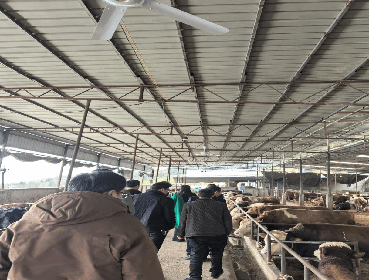 座谈会后,杨艳一行实地参观了洞湾村的特色肉牛养殖场,仔细查看了肉牛的品种、长势、饲养环境,详细询问了养殖规模、饲草来源、经营模式、市场销售以及带动村民就业增收等情况。养殖场负责人唐友松介绍了肉牛养殖从起步到逐步发展的历程,以及目前面临的机遇与挑战。面对充满活力的产业现场,文学与传媒学院的师生们结合自身专业背景,积极思考,踊跃建言。围绕如何讲好“洞湾肉牛”品牌故事、挖掘产业背后的农耕文化与奋斗精神、利用新媒体平台进行可视化传播等议题,与驻村干部、养殖户进行了初步交流与探讨。大家认为,特色产业的健康发展,离不开文化的赋能与有效地传播,这正是文学与传媒学院可以发挥优势、提供支持的切入点。