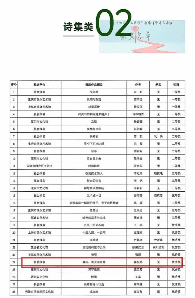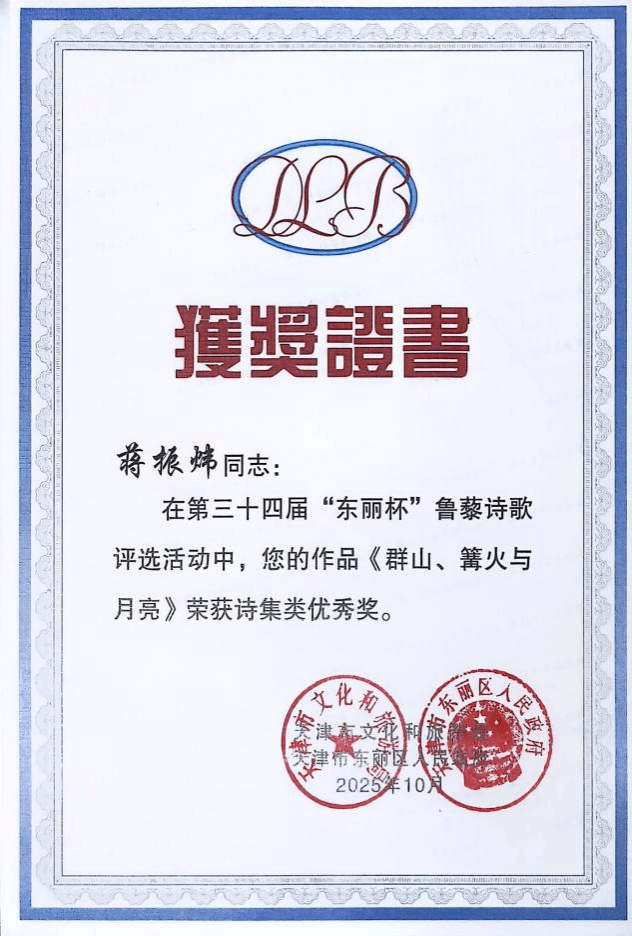 近日,由天津市文化和旅游局、东丽区人民政府主办,天津市群众艺术馆、东丽区文化和旅游局承办的第三十四届鲁藜诗歌奖获奖名单公布,我院学子蒋振炜(笔名楚槐序)的诗集《群山、篝火与月亮》荣获诗集类优秀奖。