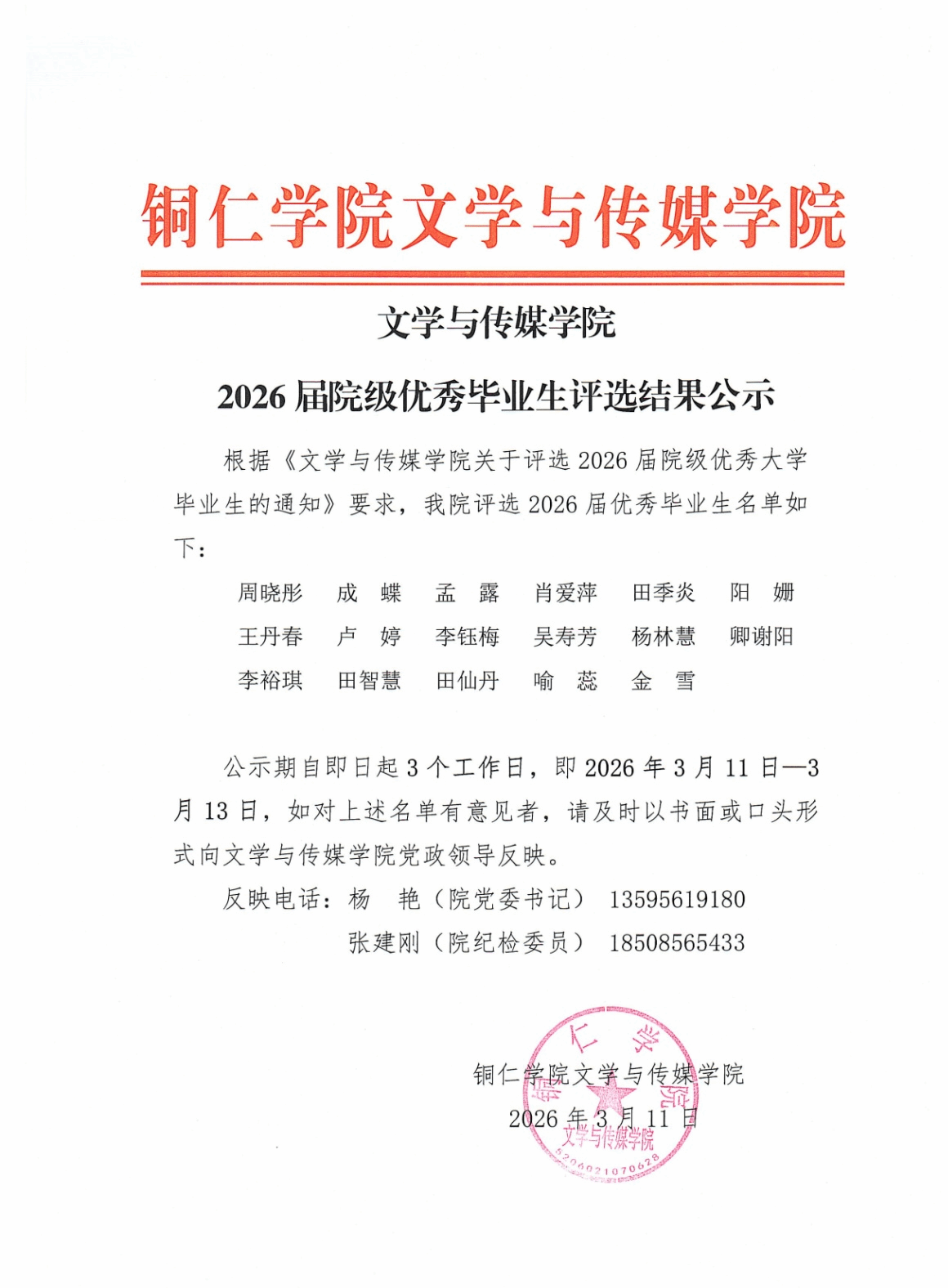 文学与传媒学院2026届院级优秀毕业生评选结果公示