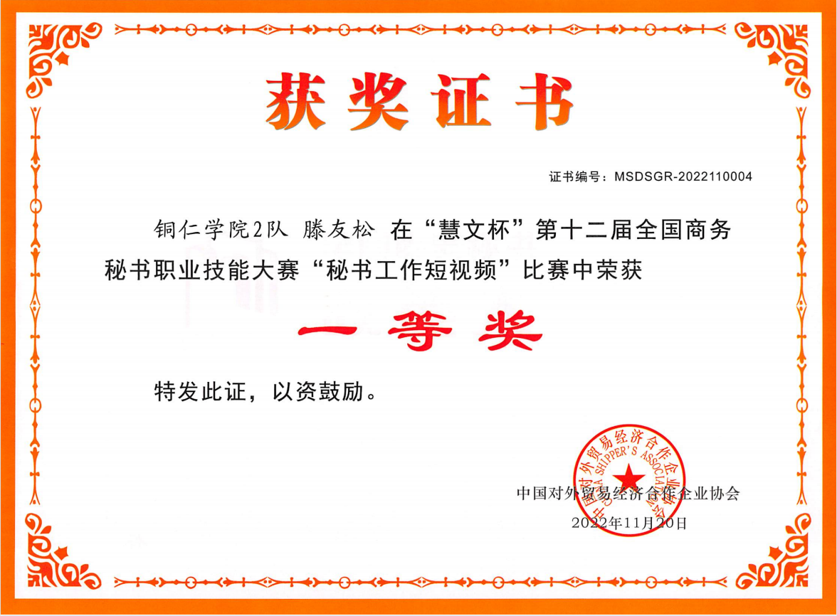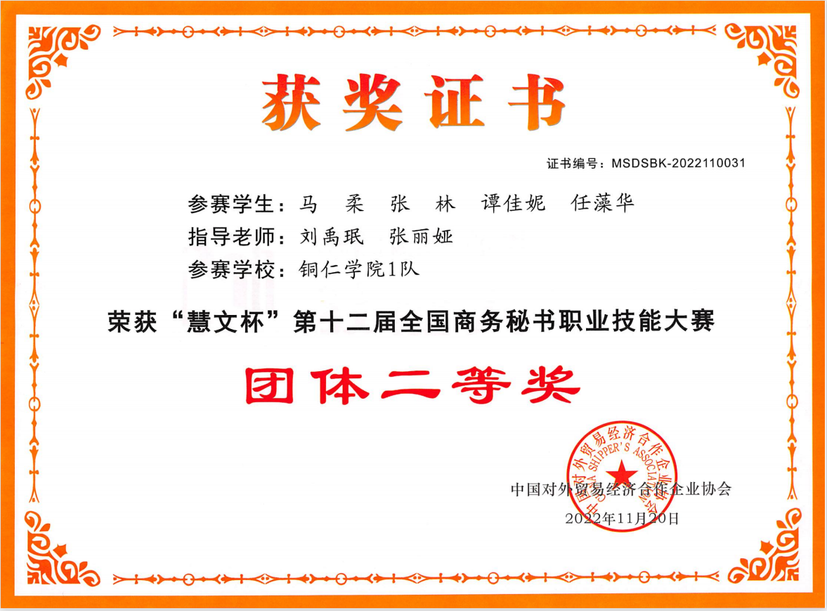 日前,中国对外贸易合作经济企业协会公布了“慧文杯”第十二届全国商务秘书职业技能大赛获奖名单。由美加墨世界杯官方网站秘书学专业2021级学生王江萍、吕佩遥、滕友松、李剑兰组成的美加墨世界杯官方网站2队荣获本科组团体一等奖;2020级学生马柔、张林、谭佳妮、任藻华组成的美加墨世界杯官方网站2队荣获本科组团体二等奖。滕友松荣获大赛自选赛项“秘书工作短视频”一等奖,任藻华、马柔、谭佳妮荣获二等奖。郭征帆、杨雪、刘禹珉、张丽娅荣获优秀指导教师称号。