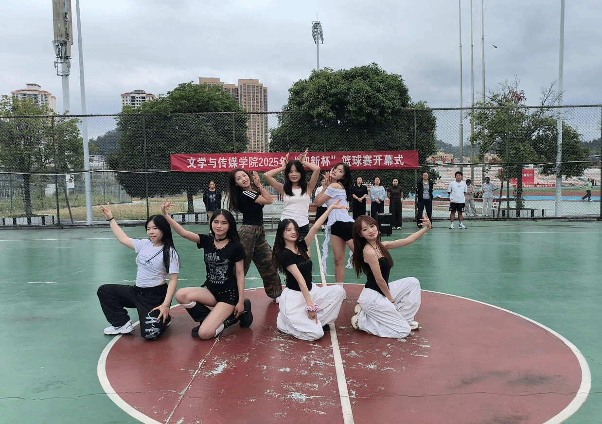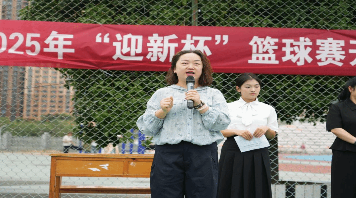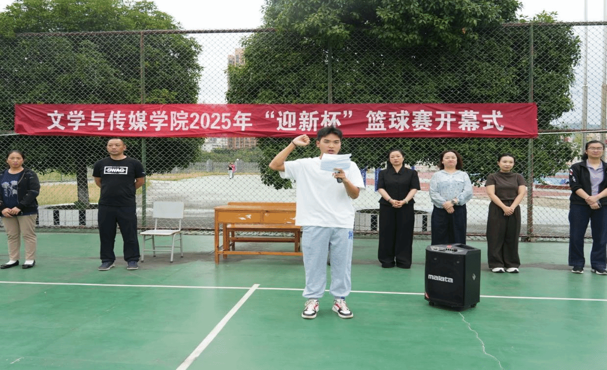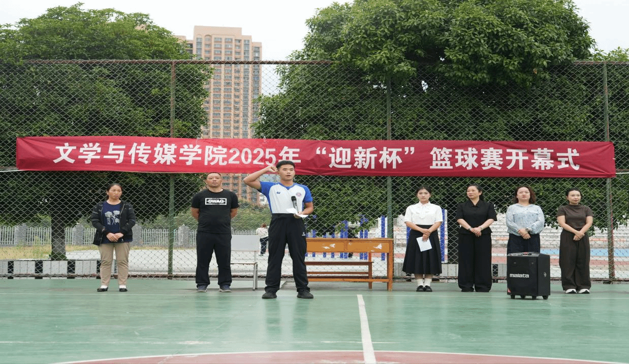 随后,学院党委书记杨艳宣布:“文学与传媒学院2025年‘迎新杯’篮球赛,开幕!”现场掌声雷动,比赛正式开启。