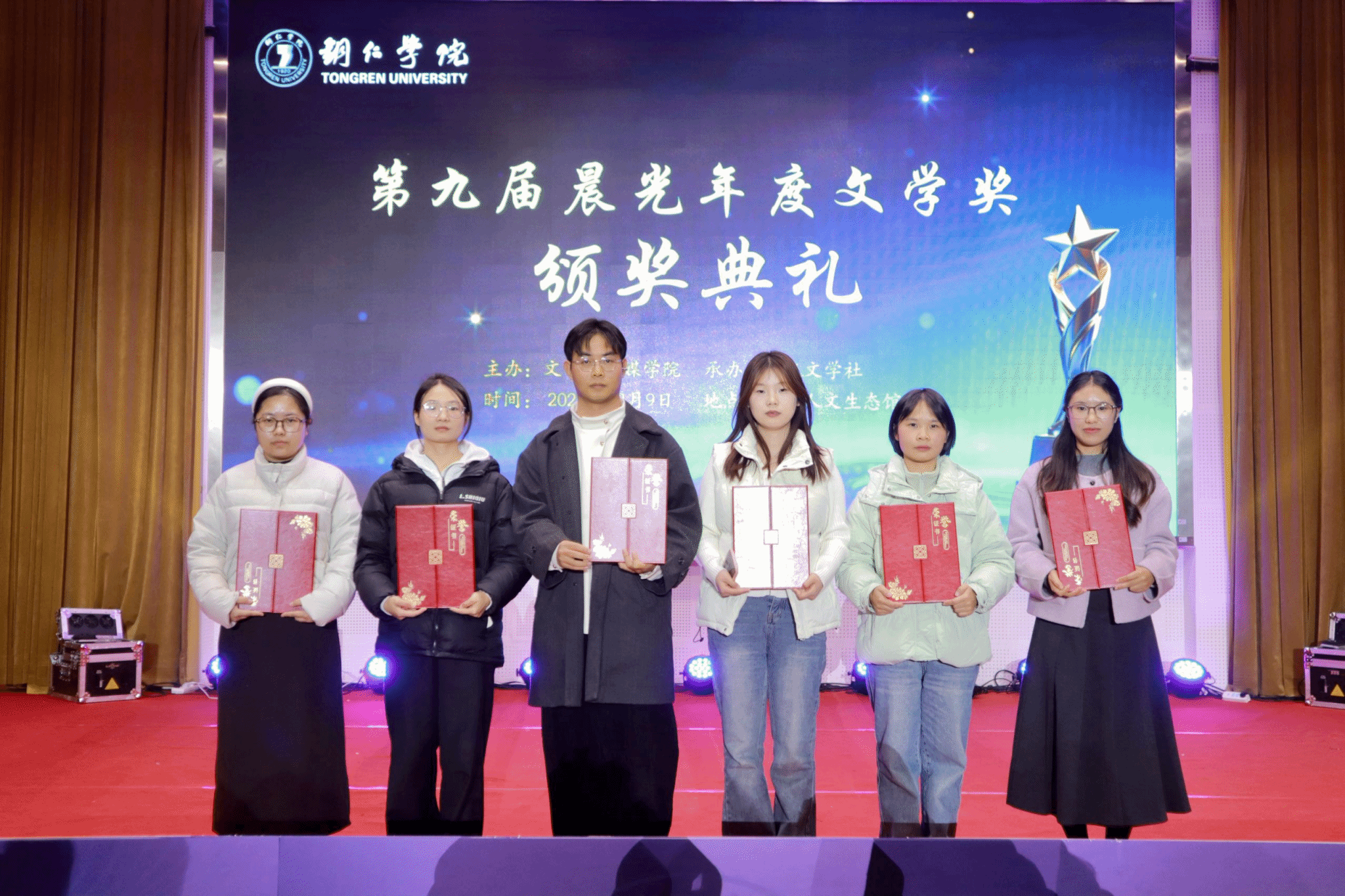 本届奖项共评选出“晨光之星奖”与“优秀作品奖”。卢婷《我叫李阳光》、蒋振炜《山居帖》(组诗)、龙青《老旦的除夕》获“晨光之星奖”;另有5位同学牟群《重寻记号》、温颖异《观喜》、杨湘《别说以后》、王丹春《许愿者(二首)》、刘莎莎《尖刺》获“优秀作品奖”。作品题材涵盖市井生活、青春成长等多元主题,校领导与嘉宾逐一为获奖学子颁发证书并祝贺。