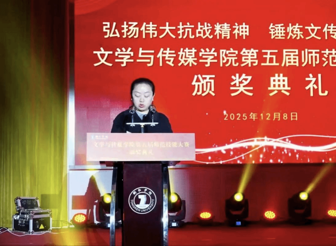 杨艳为活动致辞。她指出,本届大赛正值纪念中国人民抗日战争暨世界反法西斯战争胜利80周年,广大师生要大力弘扬伟大抗战精神,铭记历史、缅怀先烈,努力成为具有深厚爱国情怀、高尚道德情操与扎实专业技能的优秀教师后备力量,肩负“为党育人、为国育才”的光荣使命。近年来,学院采用“专业教育+职业训练+课堂实训”的模式促进师范生教师素养形成与基本功提升,过去一年多,学子先后荣获国家级奖项7项、省级奖项8项,在《中国校园文学》《星星》《扬子江诗刊》等期刊发表作品多篇,展现出扎实的专业功底与深厚的人文素养。